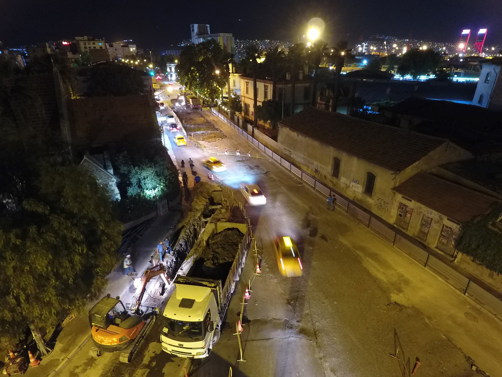 Büyükşehir Belediyesi, kent merkezindeki trafik yoğunluğunu artıran bu hassas bölgedeki çalışmaları iş takviminde planlanan süreden daha önce bitirebilmek için gece de çalışıyor. 24 saate yayılan iş temposuyla, Alsancak Garı bölgesi olarak bilinen Sait Altınordu Meydanı ile Vahap Özaltay Meydanı arası bölümde süren çalışmalar 86. İzmir Enternasyonal Fuarı'nın başlayacağı 18 Ağustos tarihinde tamamlanacak.