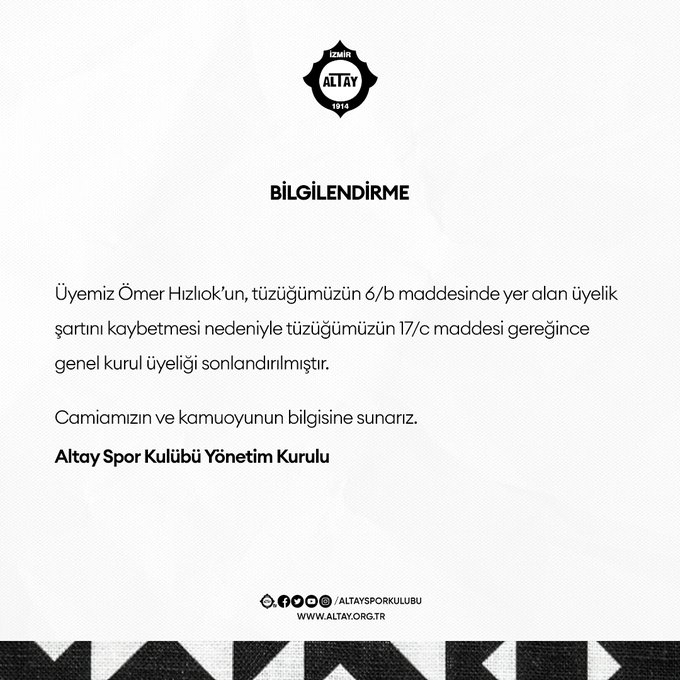 Muhittin AKBEL / EGEDESONSÖZ – Altay Kulübü, iki yıl başkanlık görevinde bulunan, iki yıl da yöneticilki yapan Ömer Hızlıok'un genel kurul üyeliğini sonlandırdı. Altay yönetimi; Üyemiz Ömer Hızlıok'n, tüzüğün 6/b maddesinde yer alan üyelik şartını kaybetmesi nedeniyle, tüzüğün 17/C maddesi gereğince genel kurul üyeliğinin sonlandırıldığı bilgisini kulübün sosyal medya hesabından duyurdu. Başkanlığı döneminde zimmetine para geçirdiği iddiasıyla hakkında dava açılan Ömer Hızlıok, iki yıl hapis cezasına çarptırılmıştı.