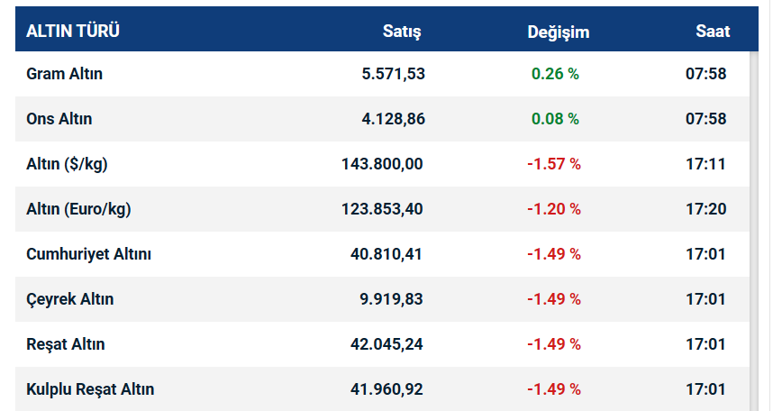 Gram altın güne 5566 liradan başladı. Gün içinde en düşük 5404 lira, en yüksek de 5590 lira seviyesi görüldü. Şu sıralar 5575 liradan alıcı buluyor.