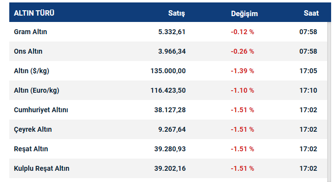 Gram altın güne 5339 liradan başladı. Gün içinde en düşük 5324 lira, en yüksek de 5371 lira seviyesi görüldü. Şu sıralar 5331 liradan alıcı buluyor.