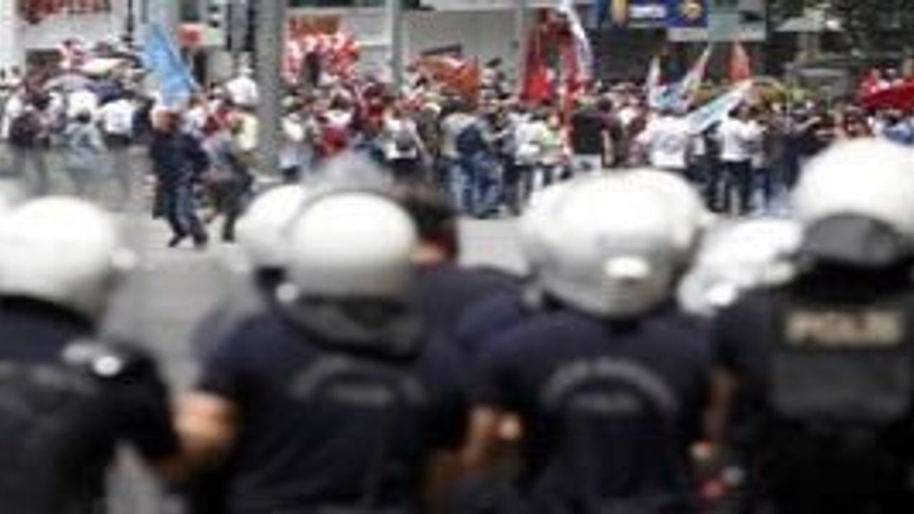 Polis göstericilerin dağılması için uyarı anonsları yapıyor. Bir grup çevik kuvvet ekibi ise müdahale için hazırlıklara başladı.