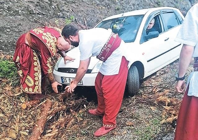 Minibüsten inen mehter takımı, aracı şarampole düşen sürücünün yardımına koştu. Yaklaşık 10 kişilik grup, el birliğiyle aracı yeniden yola çıkarmayı başardı. Sürücü, Mehter Başı Oğuz Sırlı ve arkadaşlarına teşekkür etti. (Yeni Asır)