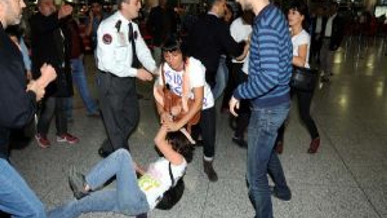 Protestocu gruba bazı yolcular da tepki gösterdi. Bir kadın yolcunun, elinde bulunan plastik dövizi, polisin gözaltına aldığı bir kadın göstericinin kafasına vurduğu görüldü. Aynı yolcu, kadın eylemciye tokat da savurdu. Ancak sivil polisin son anda göstericiyi kenara çekmesi üzerine, eylemci tokattan kurtuldu.