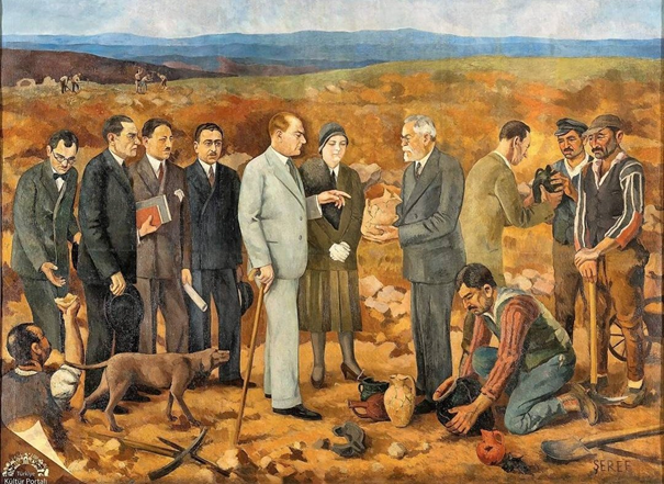 Şeref Akdik'in “Atatürk Ahlatlıbel'de Kazıda" resmi, 5 Mayıs 1933 tarihinde yapılan bu ziyareti gösteriyor. Atatürk, Milli Eğitim Bakanı Dr. Reşit Galip, Ankara Valisi, Prof. Dr. Afet İnan ve Prof. Dr. Remzi Oğuz Arık ile birlikte Ahlatlıbel kazı alanını ziyarete gider. Kazı Başkanı Dr. Hamit Zübeyr Koşay’dır.