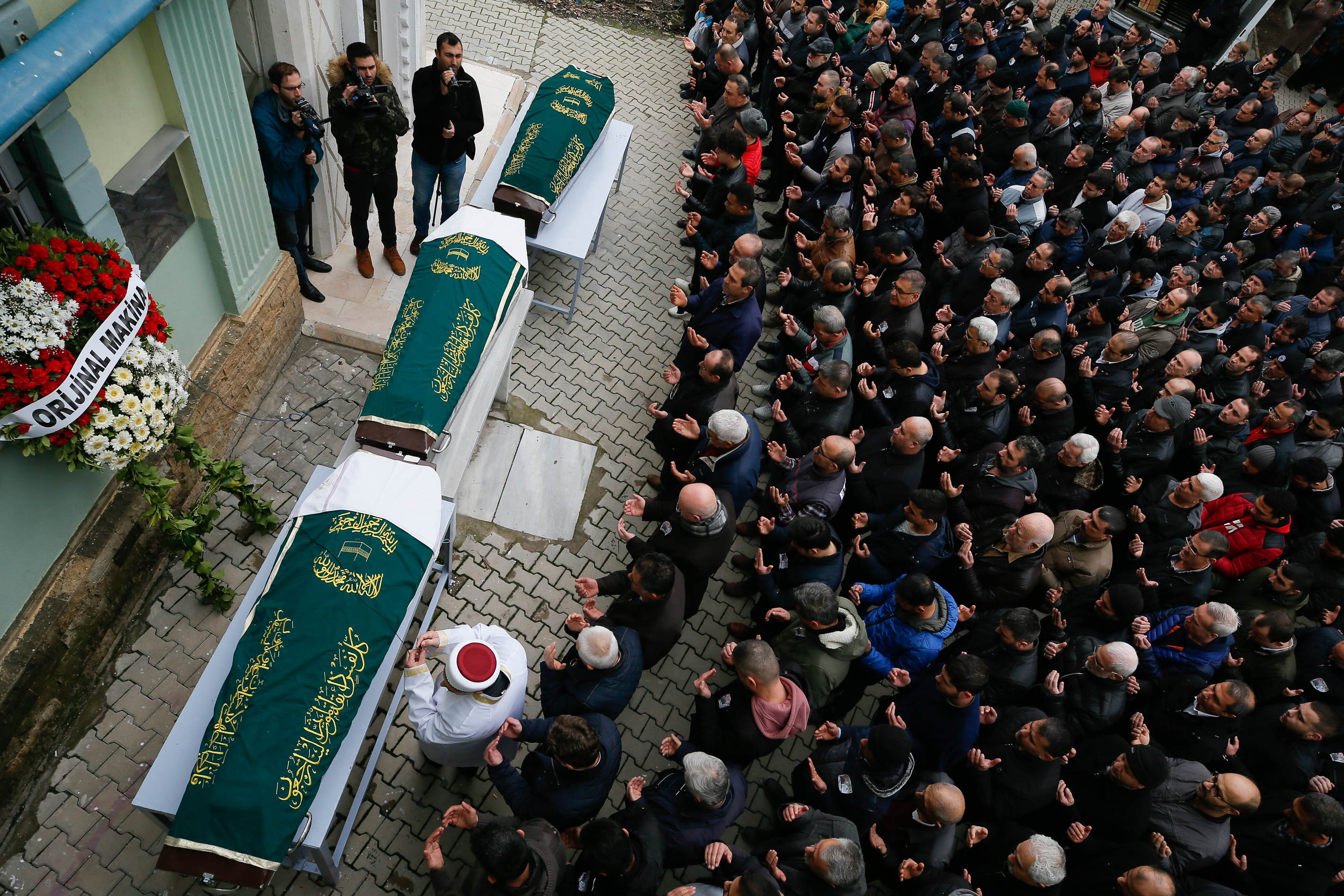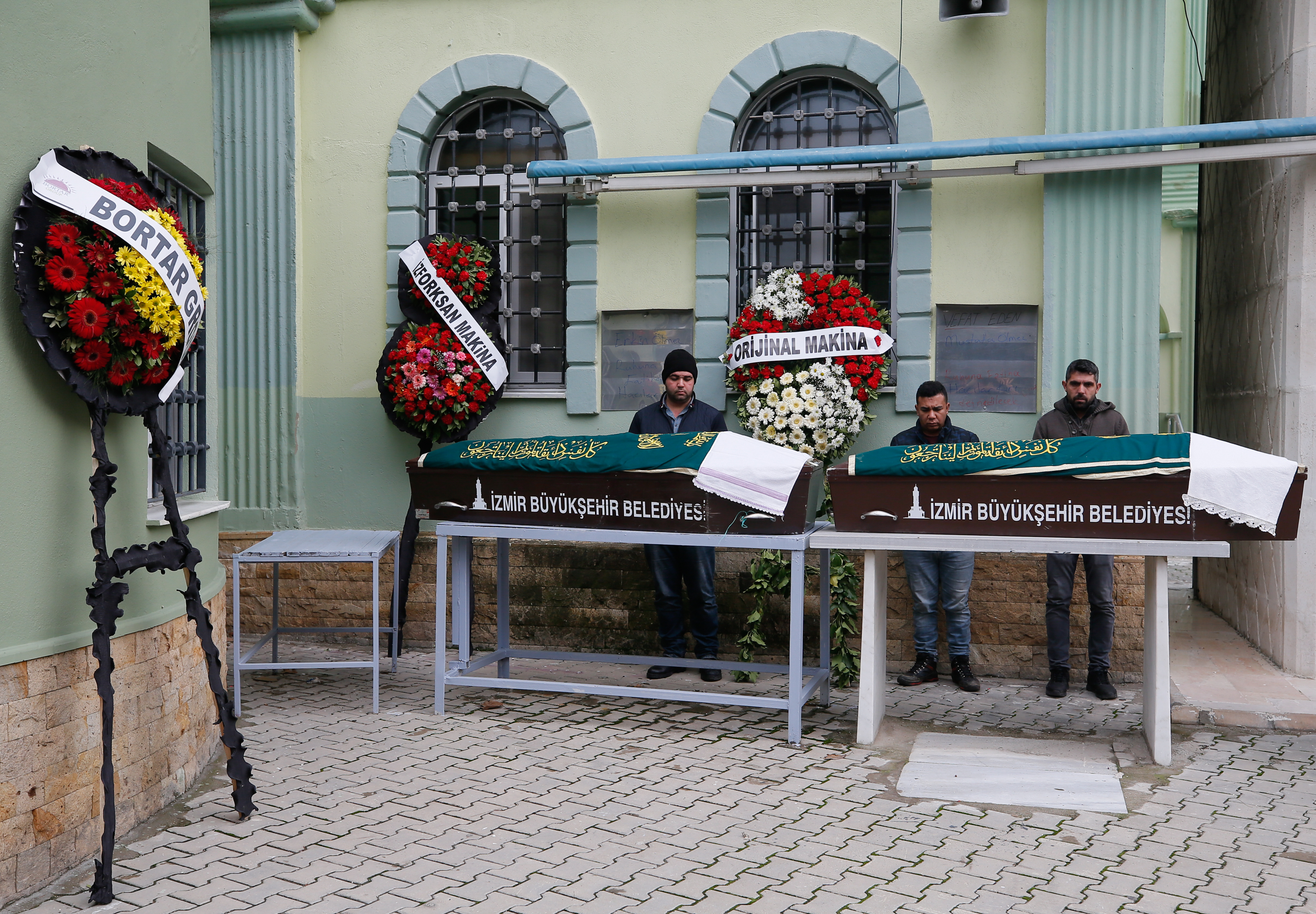 Bornova ilçesi Yeşilova Mahallesi'ndeki Ulu Cami'ye getirilen Mustafa ve Erkin Ölmez kardeşlerin tabutlarının üstüne havlu konuldu.