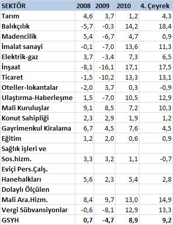 2010'da daralma gösteren sektör bulunmadı. Ancak en küçük büyüme yüzde 0.3 ile oteller ve lokantalarda gözlendi. Kamu yönetimi-savunma, zorunlu sosyal güvenlik'te büyüme yüzde 0.5, eğitimde büyüme de yüzde 0.6'da kaldı.