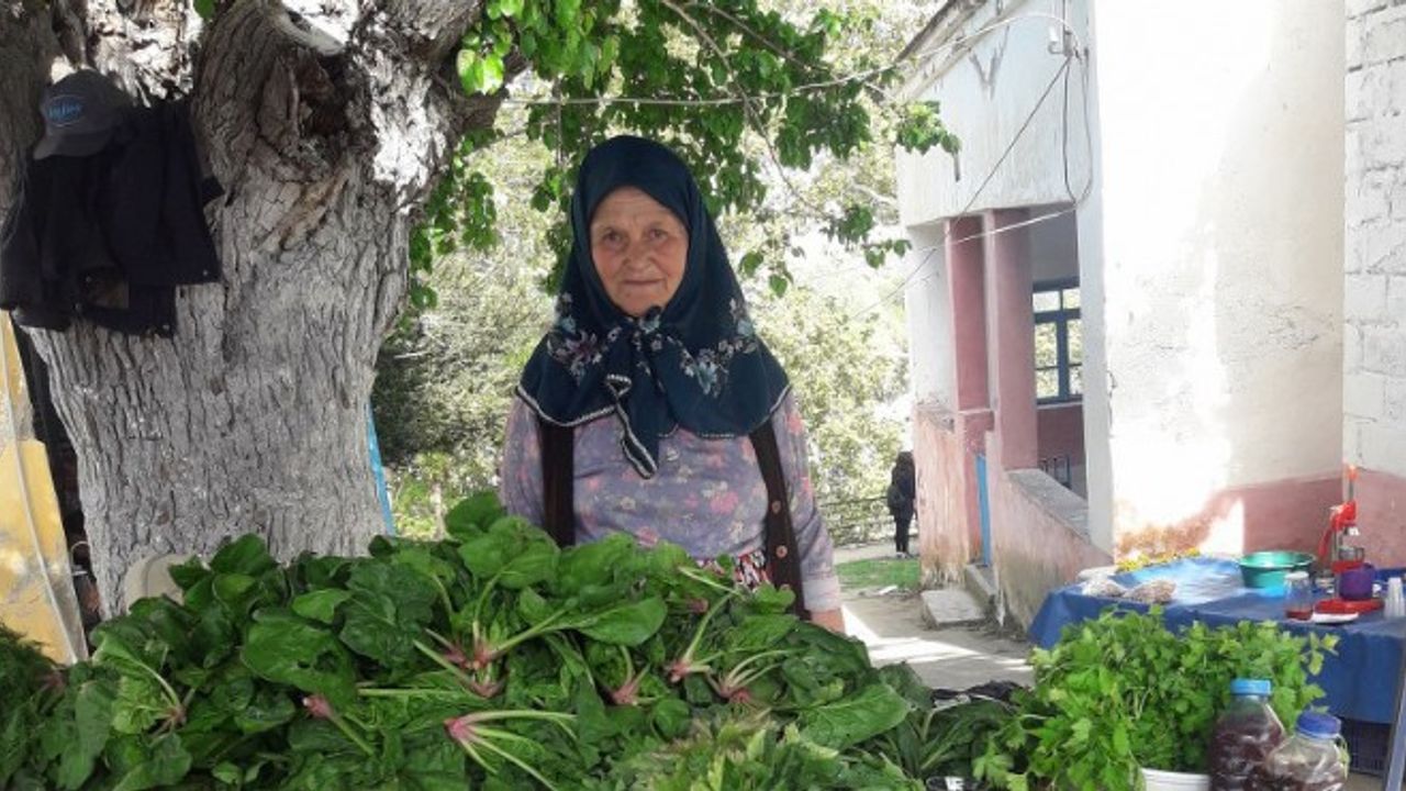 70 yaşındaki Emir Ayşe Kıllıoğlu'nun tezgahında, kendi bahçesinde hiç ilaç kullanmadan sadece hayvan gübresiyle yetiştirdiği taze soğanından marula, taze fasulyeden ıspanağa, dere otuna, rokaya, maydanoza, pırasaya kadar birçok çeşit ürün yer alıyor.