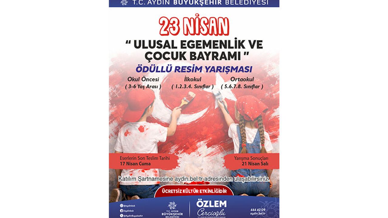 Aydın Büyükşehir Belediyesi, ’23 Nisan Ulusal Egemenlik ve Çocuk Bayramı’ temalı ödüllü resim yarışması düzenleyecek. 23 Nisan Ulusal Egemenlik ve Çocuk Bayramı temasıyla gerçekleştirilecek yarışmaya; 3-6 yaş arası okul öncesi çocukların yanı sıra ilkokul ve ortaokul öğrencileri katılabilecek. Çocuklar, Ulu Önder Mustafa Kemal Atatürk tarafından kendilerine armağan edilen bu anlamlı günün coşkusunu resimlerine yansıtacak.