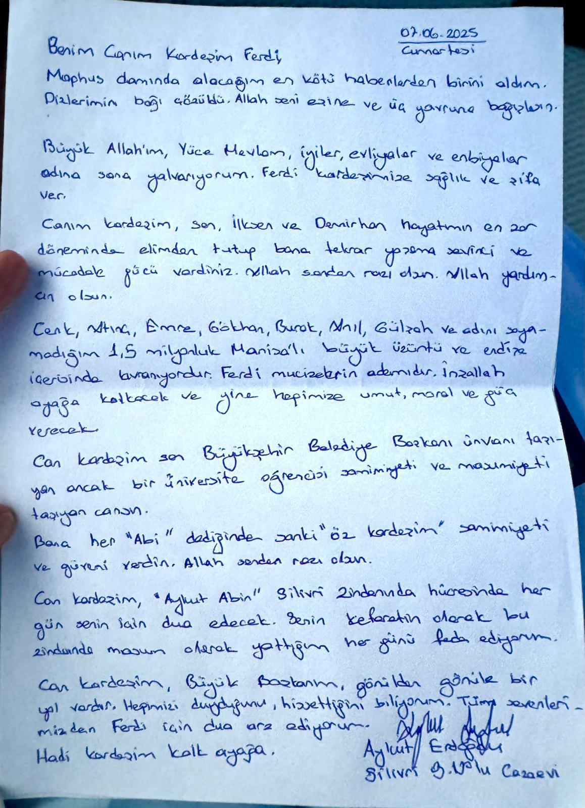 İstanbul Büyükşehir Belediyesi'ne (İBB) düzenlenen 5'inci dalga operasyonda gözaltına alınan ve 3 Haziran'da tutuklanan eski CHP Milletvekili ve Ege Planlama Ajansı Başkanı Aykut Erdoğdu, yoğun bakımda tedavisi devam eden Manisa Büyükşehir Belediye Başkanı Ferdi Zeyrek için yazdığı mektubu paylaştı.