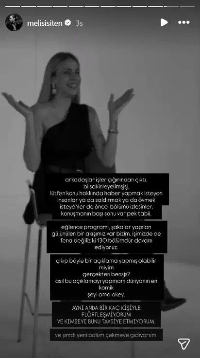 Melis İşiten, YouTube platformunda yayımlanan 'Zaten Şov' adlı programında ağırladığı Oğuzhan Uğur ile girdiği diyalog sonrası magazin gündeminin merkezine oturdu. Programda sarf ettiği, "Aynı anda 10 kişiyle flört ediyorum. Bekâr insanlar istediği kadar flört edebilir" ifadelerinin ciddi sanılması üzerine ünlü oyuncu sosyal medya hesabı üzerinden bir açıklama yayımladı.
