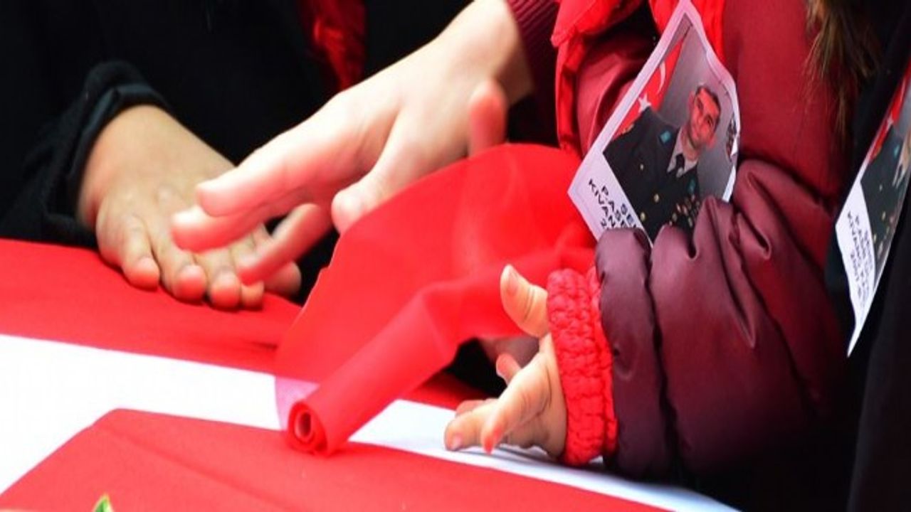 Şehit Kıvanç Kaşıkçı'nın eşi Hamiyet, 15 aylık bebeği Yağmur ile Türk bayrağına sarılı tabuta sarılarak, eşine veda etti.