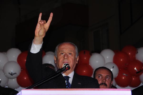 İzmir'de yaptığı seçim faaliyetlerinden söz eden MHP Genel Başkanı Bahçeli, 'Seçim faaliyetleri için 27 gün kaldı. Bu 27 gün içinde, mutlaka sandığa gitmelisiniz. Yüksek bir katılım yapmalısınız. Verilen oyların korunması da gerekmektedir. Sandık görevlisi arkadaşlarımıza büyük görev düşüyor. Çalınan oylarla kazanıyorlar, çalınan oylarla kazanınca bu defa bedava kazandıkları için Türkiye'yi de bedava zannedip başlıyorlar çalmaya. 11 yıllık iktidarlarında tek başına iktidara geldiğini iddia edenler, Türkiye'ye çağlar atlattıklarını söyleyenler, her şeyi 2002 yılından başlatıp 90 yıllık Cumhuriyet'in 80 yılını yok farz edenler, getirdikleri manzara itibariyla bugün 44 milyon yoksul vardır. Böyle bir Türkiye'de iktidar bir takım çevrelerin yolsuzluk ve rüşvetine göz kırpabilir mi? Böyle bir Türkiye'de yetimin hakkı yenebilir mi? Böyle bir Türkiye'de bir `Televizyon ele geçireceğim' diyerek salma vermek suretiyle bir havuzda 630 milyon dolar toplanabilir mi? Sayın Başbakan diyor ki 'Bunlar istikrarlı işadamlarıdır havuza girdikleri zaman ıslanmazlar' diyor. Sayın Başbakan 630 milyon yeşil Amerikan dolarının bulunduğu havuzda insan ıslanır mı? Eğer ıslanacak yer arıyorsan, şu mütevazi toplumun içine gel de yavaş yavaş nasıl ıslandığını gör. TOKİ'nin gösterişli toplantılarıyla, TOKİ'nin kürsüleriyle, arkasında yazan '143 tane tesis açıyoruz, 150 tanesinin temelini atıyoruz' diyerek milleti aldatmanın ne gereği var. İhaleleri veriyorsun. 11 işadamına 100 milyon dolar salma göndermiş. İçlerinden bir uyanık da diyor ki 'Ben 150 milyon dolar vereyim de öbür ihaleyi de bana versinler' diyor. Şu terbiyesizliğe şu haramzadeliğe bak' diye konuştu.