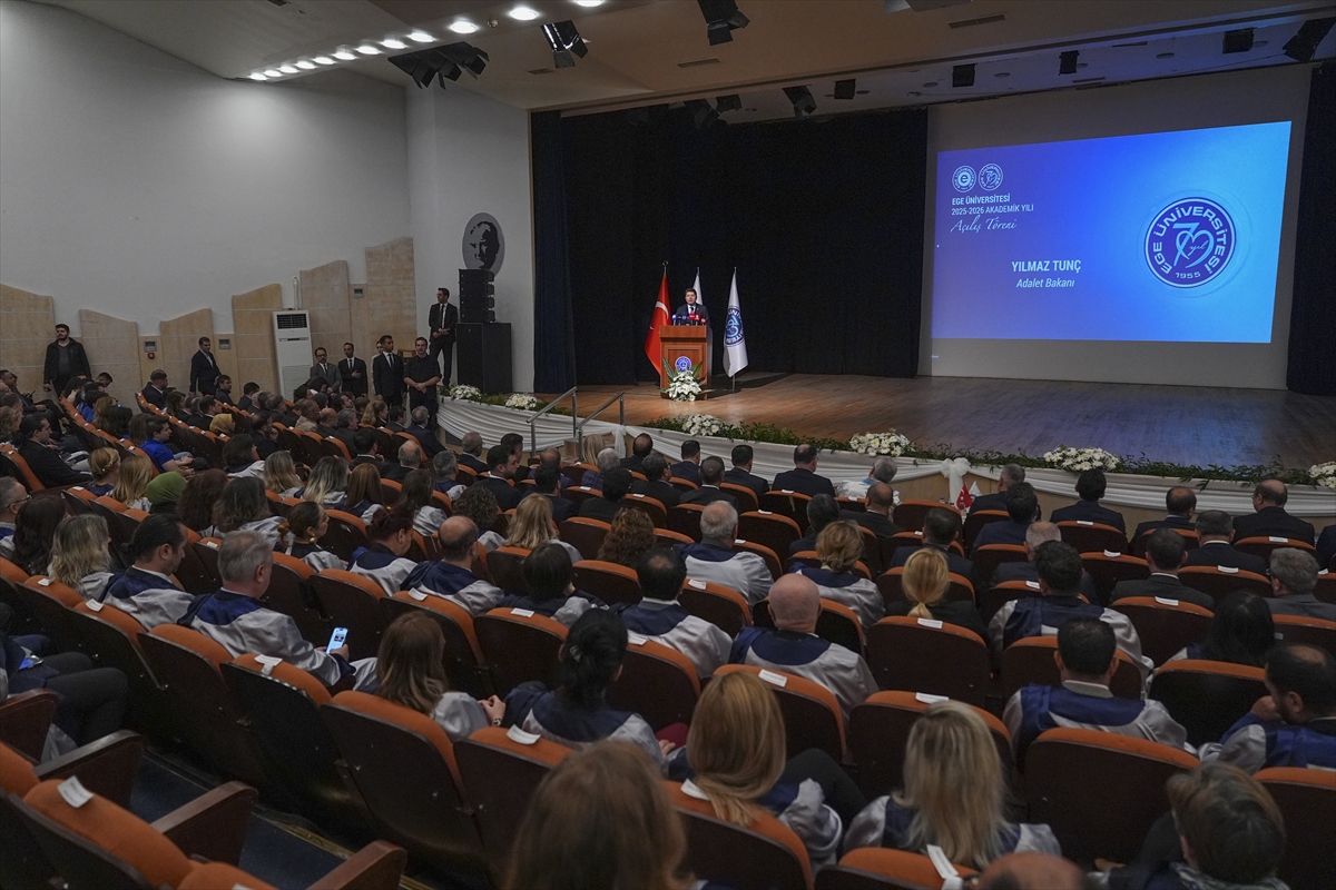 Adalet Bakanı Yılmaz Tunç, bir dizi program için İzmir'e geldi. Bakan Tunç programı kapsamında Ege Üniversitesi (EÜ) Prof. Dr. Yusuf Vardar MÖTBE Kültür Merkezi’nde düzenlenen EÜ 2025-2026 Eğitim Öğretim Yılı Akademik Açılış Töreni'ne katıldı. Törende İzmir Valisi Süleyman Elban, EÜ Rektörü Prof. Dr. Necdet Budak, AK Parti İl Başkanı Bilal Saygılı, milletvekilleri ile akademisyenler de hazır bulundu. Program kapsamında ilk olarak EÜ halk oyunları ekibi zeybek gösterisi gerçekleştirdi. Daha sonra EÜ Medya Uygulama ve Araştırma Merkezi tarafından hazırlanan klip izletildi.