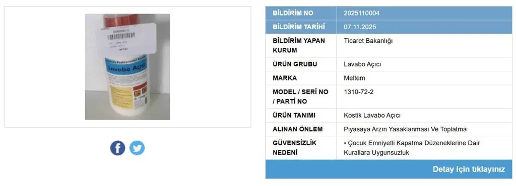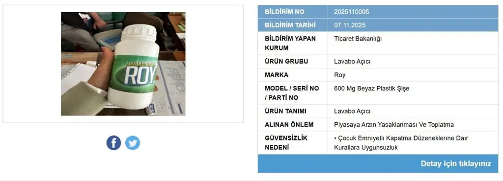 Ticaret Bakanlığı, Güvensiz Ürün Bilgi Sistemi üzerinden iki lavabo aç ürününün yasaklandığını duyurdu.
