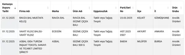 Listeye toplam 3 yeni ürün daha eklendi. Listede bal ürünleri yer aldı. Yapılan son testlerde, bazı markaların 'bal' ibaresiyle sattığı üründe taklit veya tağşiş yaptığı belirlendi.