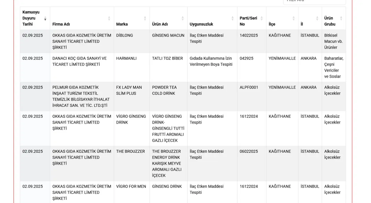 Diğer yandan The Brouzzer adlı markanın karışık meyve aromalı gazlı içeceğinde olmaması gereken bir ilaç bulunduğu ifade edildi. İlaç etken maddesi tespit edilen bir diğer ürün de Vigro for Men markasının ginseng içeceği oldu.