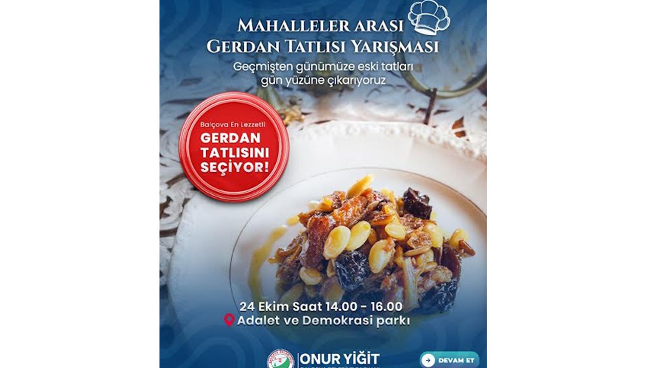 Bu kapsamda gerçekleştirilecek Gerdan Tatlısı Yarışması, 24 Ekim 2025 Cuma günü saat 14.00 – 16.00 arasında Adalet ve Demokrasi Parkı’nda yapılacak. Mahalleler arası olarak düzenlenen yarışma, hem Balçovalıları bir araya getirecek hem de geleneksel mutfak kültürüne dikkat çekecek.