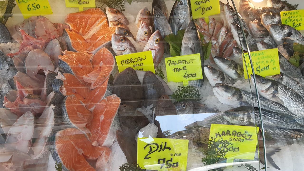 Balık satışı yapan esnafın tezgahında balıklar, farklı etiketler taşıyor. Üretim levrek ve çipura ortalama 450 liradan satılıyor. Toprak havuz levrek ve çipura fiyatı 500 lira… Deniz levrek ve çipura, 800 lira. Karagöz 800, Tekir 900, Granyoz 650, Tavuk balığı 850, palamut 400 liradan satılıyor.