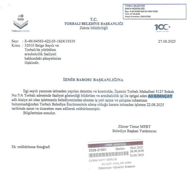 İzmir Barosu tarafından yapılan açıklamada, “Bir meslektaşımız tarafından, Torbalı Adliyesi önüne ilan panosu yerleştirilerek “arzuhalcilik” adı altında yalnızca avukatların faaliyet gösterebileceği alanlarda hizmet verildiğine ilişkin bildirimde bulunulmuştur. Bu bildirim üzerine Torbalı Belediye Başkanlığı’na yazı yazılarak, söz konusu faaliyetin sonlandırılması; ayrıca ruhsat başvurusunda bulunulması halinde kanuna açık aykırılık hali dikkate alınarak talebin reddedilmesi istenmiştir. Başvurumuz üzerine Torbalı Belediyesi Zabıta Müdürlüğü tarafından yapılan yerinde denetimde, ilgili kişinin işyeri açma ve çalışma ruhsatı bulunmadığı tespit edilmiştir. Encümen kararı uyarınca işletme sanat ve ticaretten men edilerek mühürlenmiştir” ifadelerine yer verildi.
