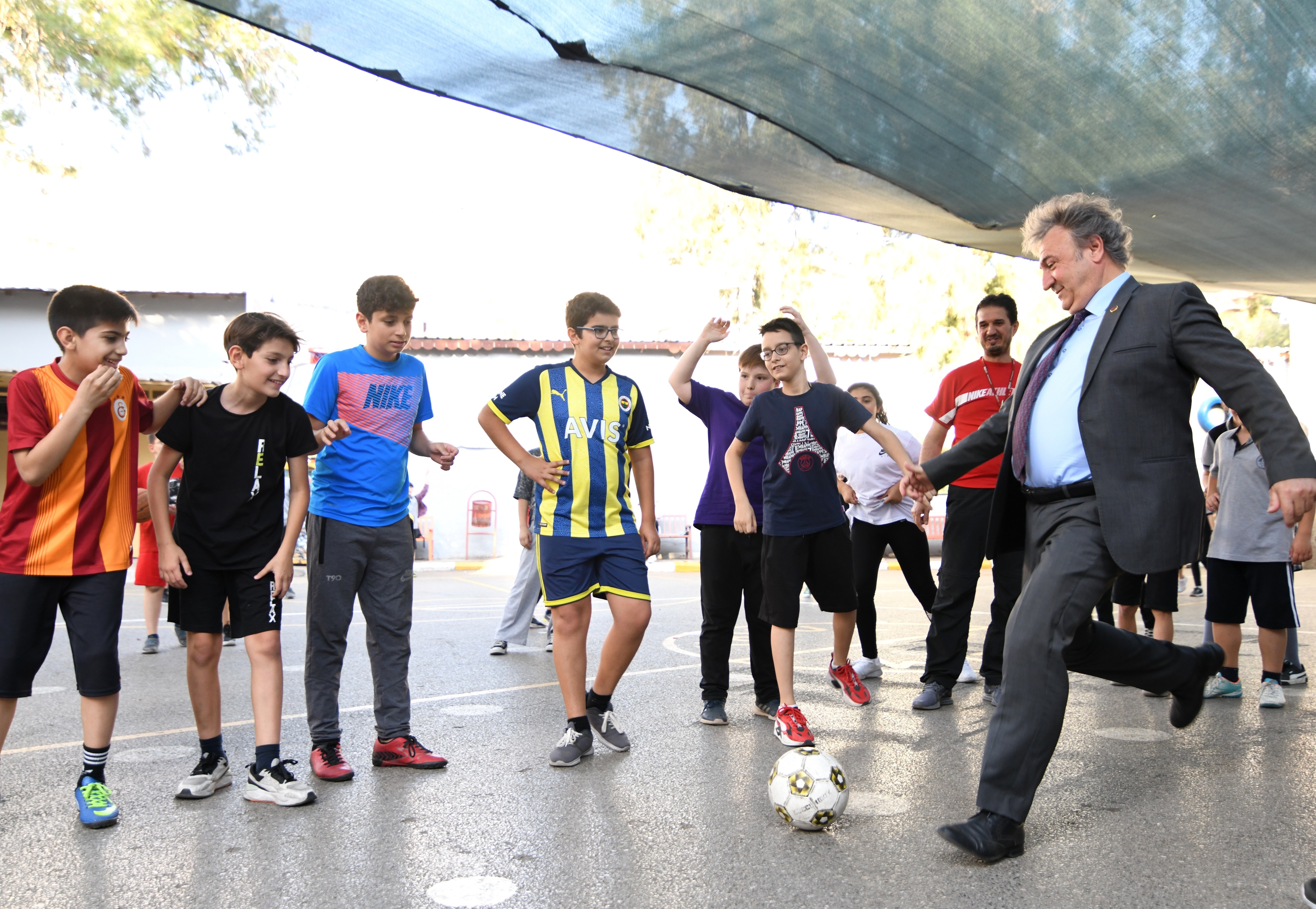 Mezunu olduğu okulun bahçesinde hatıra fotoğrafı çektiren Bornova Belediye Başkanı Dr. Mustafa İduğ, beden eğitimi dersinde öğrencilerle penaltı atışı da yaptı.
