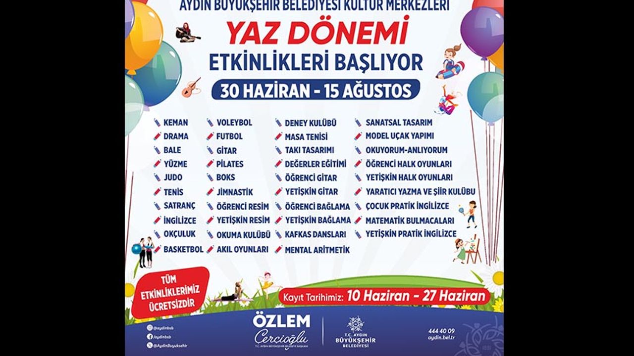 Okulların kapanması ile birlikte yaz tatiline başlayacak olan, zamanlarını dolu dolu geçirmek isteyen çocuklar ile kişisel gelişimlerine katkı sağlamak isteyen yetişkinlere yönelik ‘Aydın Büyükşehir Belediyesi Kültür Merkezleri Yaz Dönemi Etkinlikleri’ için başvurular 27 Haziran tarihine kadar gerçekleştirilecek. Sanat, spor ve eğitici etkinlikler aracılığıyla her zaman vatandaşların yanında olduklarını belirten Aydın Büyükşehir Belediye Başkanı Özlem Çerçioğlu, “Her yıl olduğu gibi bu yılda hem çocuklarımız hem de yeteneklerini geliştirmek isteyen vatandaşlarımız için Yaz Dönemi Etkinliklerimizi gerçekleştireceğiz. Yaz tatilinde eğlenirken öğrenmek isteyen çocuklarımızı ve yeteneklerini geliştirerek keyifli vakit geçirmek isteyen tüm vatandaşlarımızı etkinliklerimize bekliyoruz” dedi.