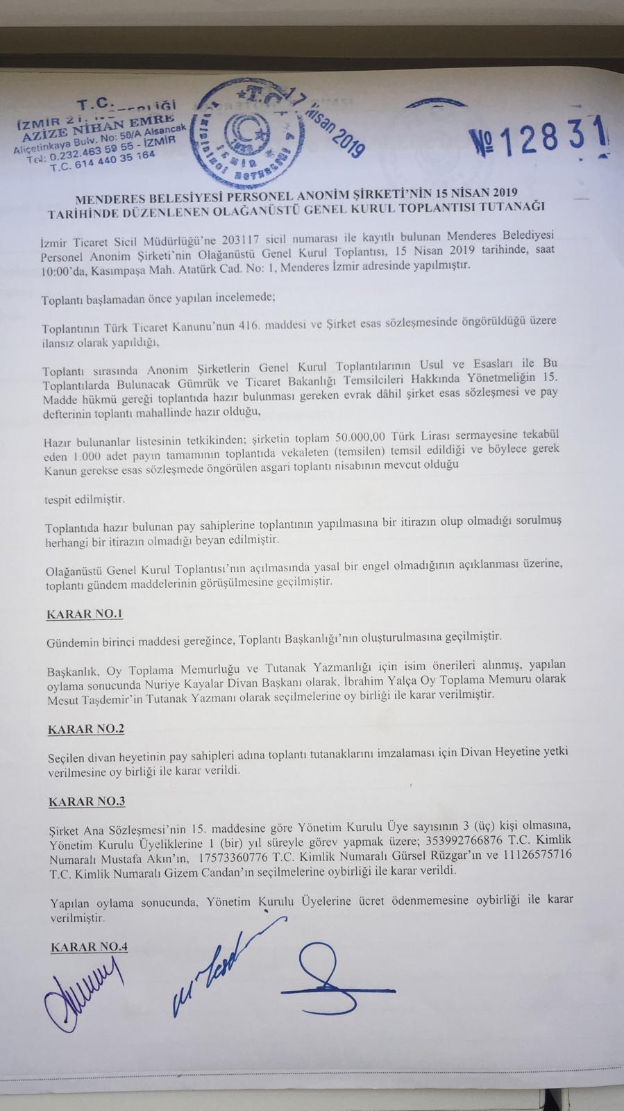 CHP İlçe Başkanı Gizem Candan'ın belediye meclis üyeleri Gürsel Rüzgar ve Mustafa Akın ile birlikte Menderes Belediyesi Personel Anonim Şirketi'nin yönetim kurulu üyesi olduğunu vurgulayan Kayalar, 'Her üç isim de yönetim kurulu üyesi olarak şirketten herhangi bir ücret almayacaklarını 17 Nisan'da noter tasdikiyle beyan ettiler. Gizem Candan'ın avukat olması ve belediyemizin geçmiş yönetimden kalan borçları nedeniyle yaşadığı maddi sıkıntıyı göz önüne alarak tasarruf tedbirleri kapsamında böyle bir uygulamaya gidilmiştir' dedi. (DHA)