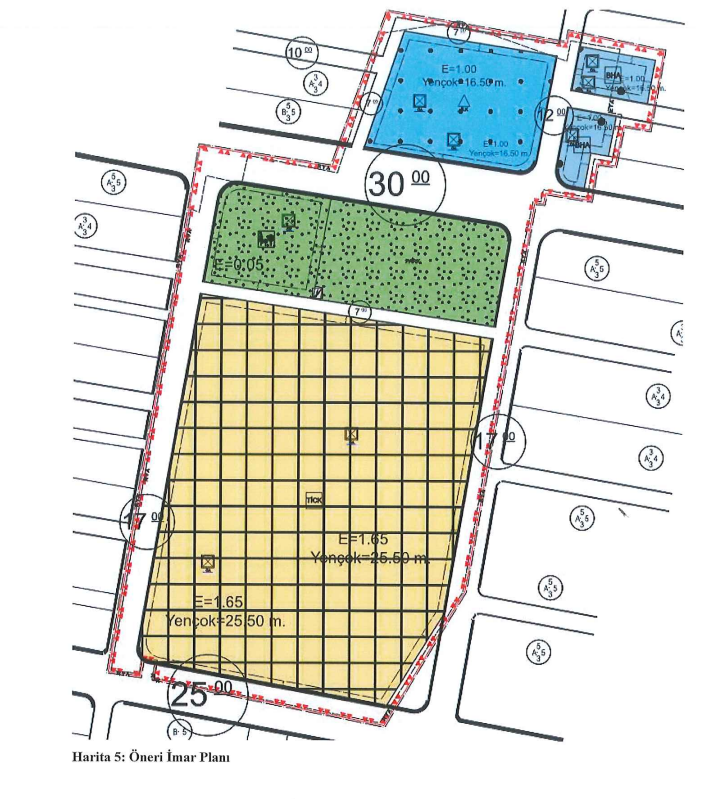 Bakanlığın yeni planlamasında ise 42 bin 336 metrekarelik ticaret ve konut alanı, 7 bin 819 metrekarelik ilkokul alanı, 2 bin 607 metrekarelik belediye hizmet alanı, 13 bin 496 bin metrekarelik yol ve otopark alanı, 20 bin 500 metrekarelik açık ve yeşil alan belirlendi. Ticaret ve konut alanı için 1,65 emsal, okul ve belediye hizmet alanı için 1 emsal, yeşil alan için 0,05 emsal yapılaşma hakkı tanındı.