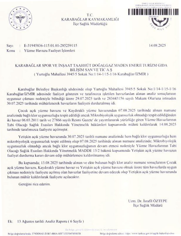 Tesislerde bu süreçte kapsamlı bakım, temizlik ve dezenfeksiyon işlemleri uygulanmış; Bakanlıkça yetkilendirilmiş akredite havuz sorumlusu firma ve personeli tarafından alınan numuneler ve günlük analizler ile olumsuzluk olmadığı görülmüştür. Süreç kapsamında İlçe Sağlık Müdürlüğümüz tarafından da kontrol amaçlı numuneler alınmış, yetkililere gerekli bilgilendirmeler yapılmıştır. Olumsuzluğun giderilmesi üzerine tesisimiz 02 - 03 Ağustos 2025 tarihlerinde hizmet vermiştir.