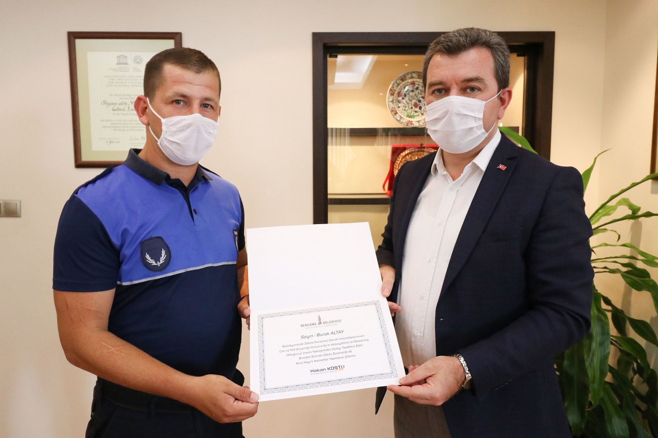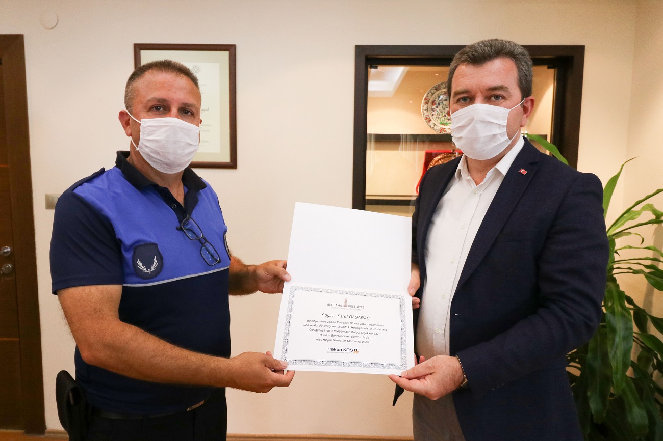 Pazaryerinde bulunan cüzdanı sahibi Şennur Durmaz'a ulaştırabilmek için adeta dedektif gibi çalışan Zabıta Memurları Eşref Özsaraç ve Burak Altay'ı bu örnek çalışmalarından ötürü kutlayan Bergama Belediye Başkanı Hakan Koştu, her iki memuru teşekkür belgesi ve ikramiye ile ödüllendirdi. Başkan Koştu, 'Geçmişten günümüze yardımlaşmayı seven, kendisinin olmayanı bulduğunda sahibine ulaştırmak için uğraş veren, birisi bilmediği adresi sorduğunda adrese kadar götüren değerlere sahip bir milletiz. Zabıta kardeşlerimizin göstermiş oldukları bu hassasiyette bizim bu değerlere sahip olmamızın bir yansımasıdır. Üstelik bu iki kardeşimiz cüzdanı bulup, sahibi gelip alsın diye beklemeden adeta dedektif gibi uğraş vererek en kısa zamanda sahibine teslim ederek güzel bir davranış örneği sergilemişlerdir. Kendilerini kutluyorum' dedi.