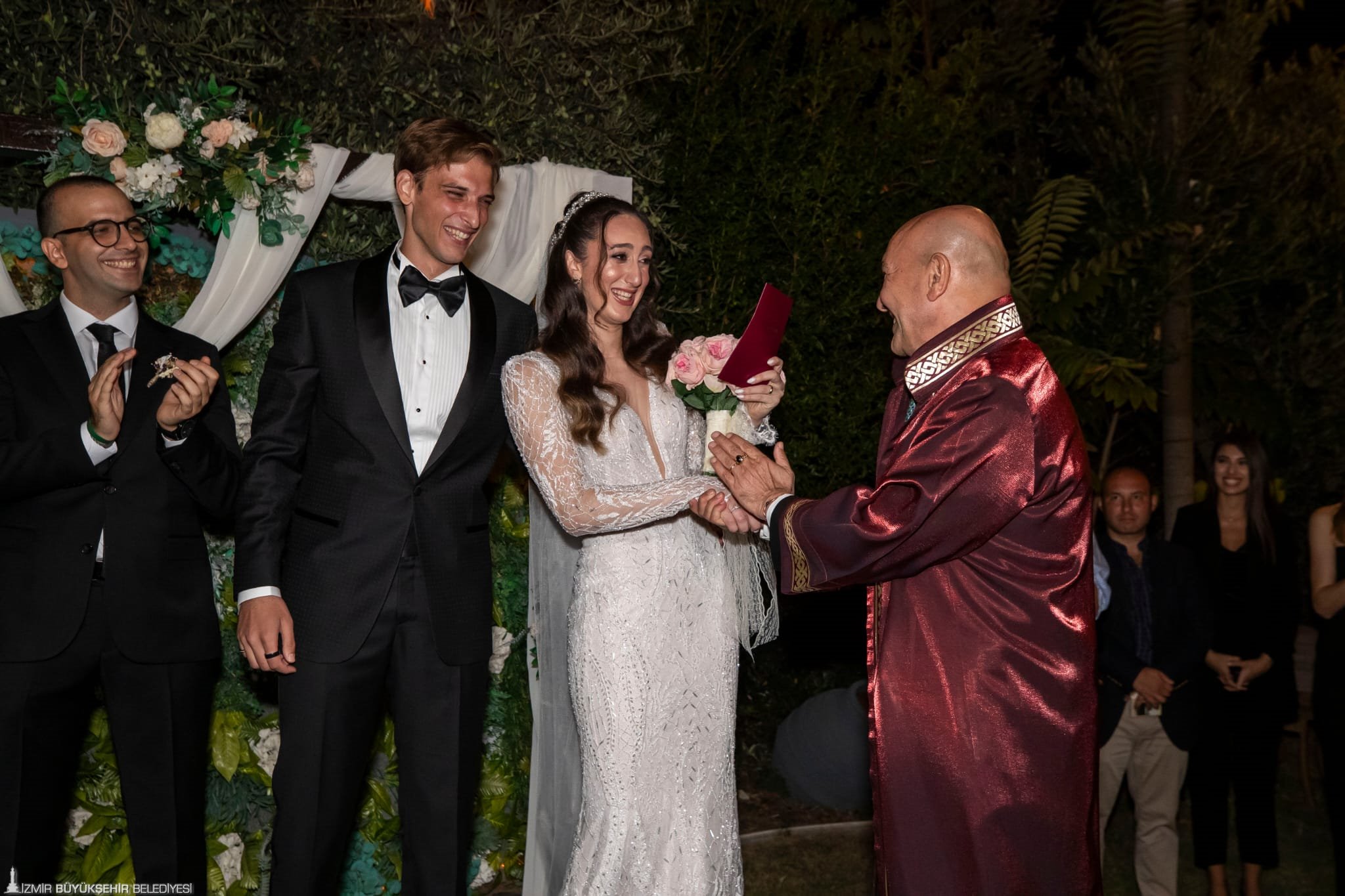 Nikah töreninde genç çifte ömür boyu mutluluk dileyen Başkan Tunç Soyer, 'Ben 14 buçuk senedir nikah kıyıyorum ama bu kadar şampiyonun önünde nikah kıymak beni çok heyecanlandırdı. Bize unutulmaz bir zafer yaşatan, bütün Türkiye'ye gurur yaşatan şampiyonlarımız için, onların anısını, zaferini ölümsüz kılmak için önce bir anıt tasarlıyoruz. Sonra da Türkiye Voleybol Federasyonu Başkanı'mızla beraber bu başarıyı sürdürülebilir kılacak bir voleybol lisesi tasarlıyoruz. İzmirliler şampiyonlarımızı asla unutmayacak. Diliyorum ki bütün bir ömür, bu güzel sonbahar akşamında olduğu gibi sevdiklerinizle mutluluk içinde geçsin' ifadelerini kullandı.