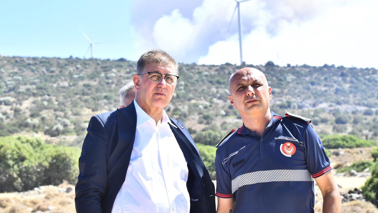 EGEDESONSÖZ- İzmir'in Çeşme ve Ödemiş ilçelerinde çıkan orman yangınları ikinci gününde de devam ediyor. Yangınlara, ekiplerin müdahalesi sürerken İzmir Büyükşehir Belediye Başkanı Cemil Tugay, yangın bölgelerini ziyaret ederek son durumu öğrendi.