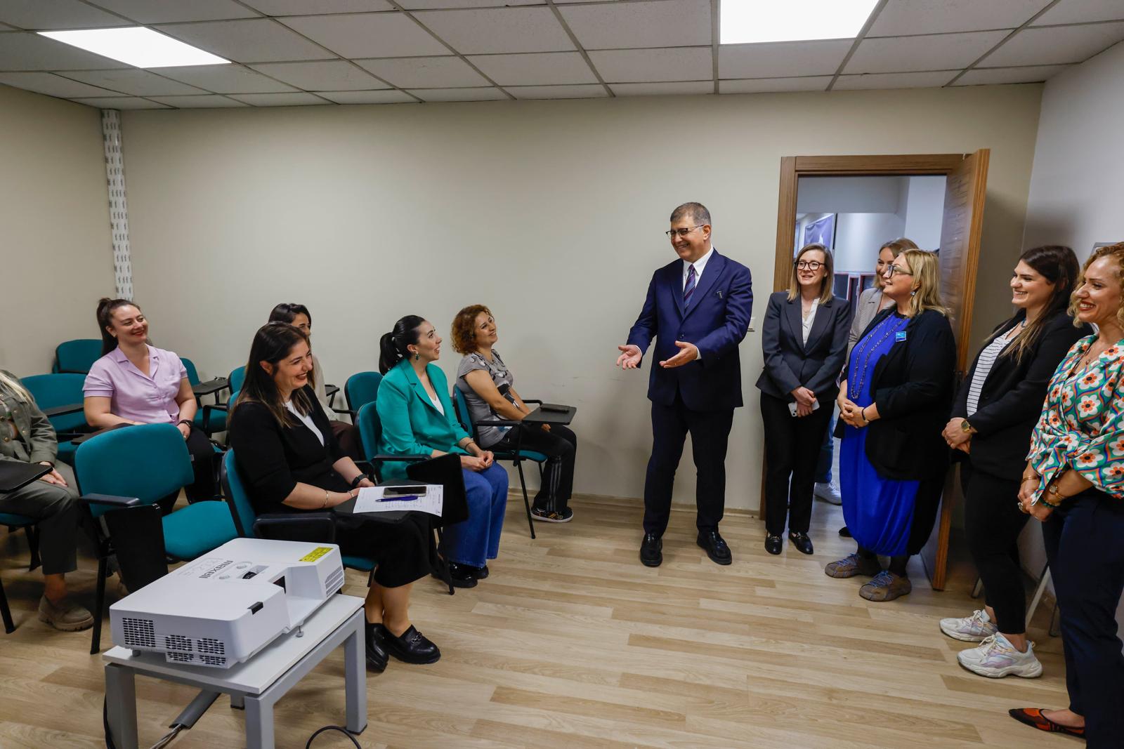 Başkan Tugay, Sosyal Yardımlar Hattı ekibini de ziyaret ederek personelle sohbet etti. Hattın günde yaklaşık bin çağrı aldığı, bayram dönemlerinde çağrı sayısının üç bine ulaştığı belirtildi. Başkan Tugay ayrıca Sağlık İşleri Dairesi Başkanlığı tarafından Eğitim ve Koordinasyon Birimi’nde verilen doğru nefes teknikleri ve omurga sağlığı eğitimlerine katılım sağlayarak eğitim alan personelle sohbet etti. Başkan Tugay, ziyaret sonunda HİM personeli ile fotoğraf çektirdi.