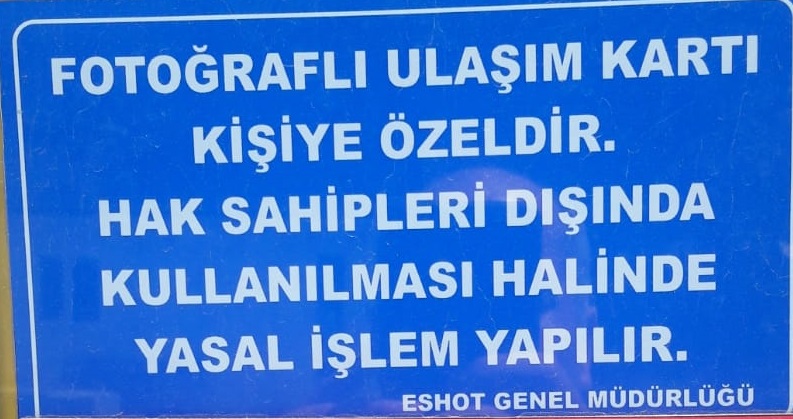 EGEDESONSÖZ- İzmir'de şehir içi ulaşımın bel kemiği olan tekerlekli taşımacılıkta önemli bir rol üstlenen ESHOT Genel Müdürlüğü bir yandan hizmet verirken diğer yandan denetimleri arttırdı. Kurum, İzmir genelinde indirimli ve ücretsiz kart kullanma hakkına sahip olan kişilerin kartlarını başkalarına verenleri uyardı. Konuyla ilgili afiş ve duyuru çalışmaları yapılırken uyarıları dikkate almayanların tespit edilmesi halinde yasal işlem yapılacağını belirtti.