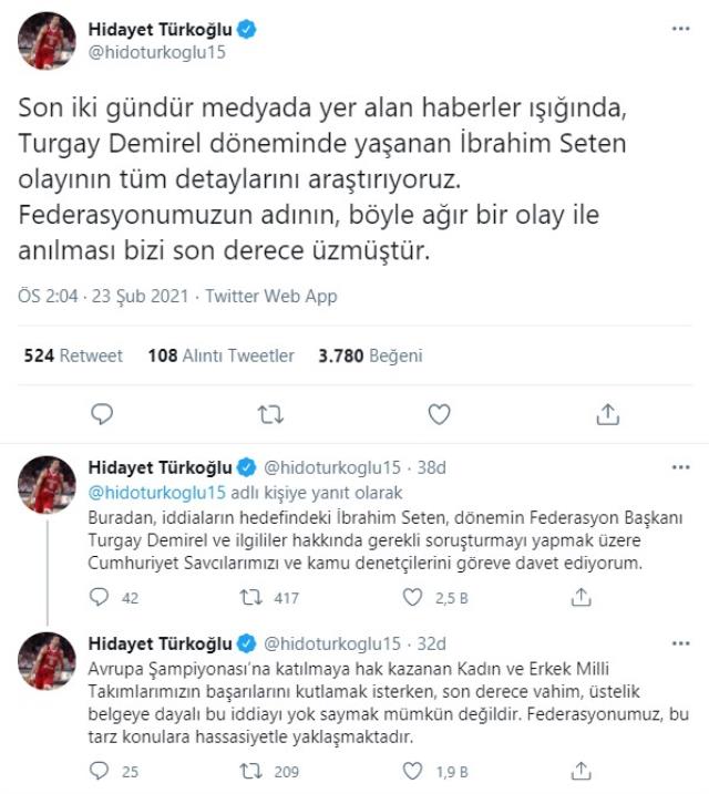 Savcıları ve kamu denetçilerini göreve çağıran Türkoğlu, 'Son iki gündür medyada yer alan haberler ışığında, Turgay Demirel döneminde yaşanan İbrahim Seten olayının tüm detaylarını araştırıyoruz. Federasyonumuzun adının, böyle ağır bir olay ile anılması bizi son derece üzmüştür. Buradan, iddiaların hedefindeki İbrahim Seten, dönemin Federasyon Başkanı Turgay Demirel ve ilgililer hakkında gerekli soruşturmayı yapmak üzere Cumhuriyet Savcılarımızı ve kamu denetçilerini göreve davet ediyorum. Avrupa Şampiyonası'na katılmaya hak kazanan Kadın ve Erkek Milli Takımlarımızın başarılarını kutlamak isterken, son derece vahim, üstelik belgeye dayalı bu iddiayı yok saymak mümkün değildir. Federasyonumuz, bu tarz konulara hassasiyetle yaklaşmaktadır' ifadelerini kullandı.