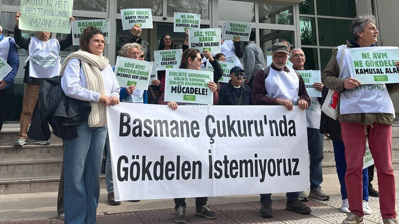 Eylemde, ‘Basmane çukuru halkındır halkın kalacak’, ‘Basmane Çukuru kamusal alan’, ‘halk burada Cemil nerede’ sloganları atıldı.