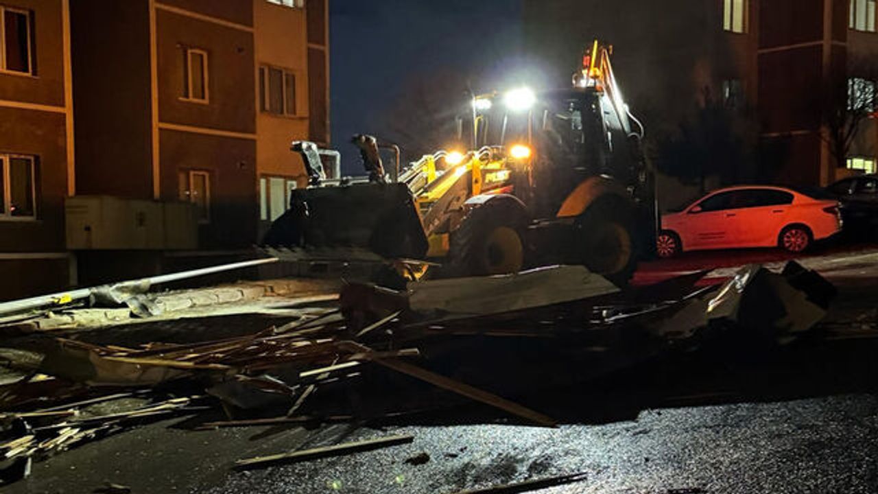 Kuvvetli rüzgar kent merkezinde bazı binaların çatılarının uçmasına neden oldu. Düşen çatı parçaları, kuvvetli rüzgar nedeniyle etrafa dağıldı.