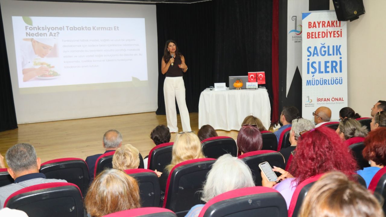 Bayraklı Belediyesi Sağlık İşleri Müdürlüğü tarafından Osmangazi Hizmet Binası Konferans Salonu’nda gerçekleştirilen seminerde, İzmir Büyükşehir Belediyesi Eşrefpaşa Hastanesi Fonksiyonel Tıp Diyetisyeni Aycem Pehlivan, uzun ve kaliteli bir yaşam için yapılması gerekenleri anlattı. Seminere Bayraklı Belediyesi meclis üyeleri ve çok sayıda vatandaş katıldı.