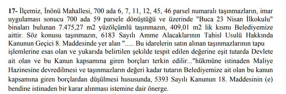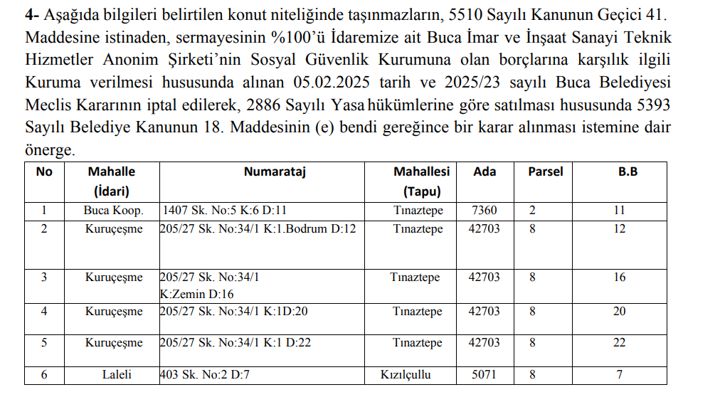 Yine Buca Belediyesi mülkiyeti kendisine ait 6 konutu Buca 23 Nisan İlkokulu arsasındaki hissesini de Buca İmar ve İnşaat Sanayi Teknik Hizmetler Anonim Şirketi’nin borçlarına karşılık Sosyal Güvenlik Kurumu'na devri için de çalışma başlattı. Bu öneri de meclis de tartışılacak.