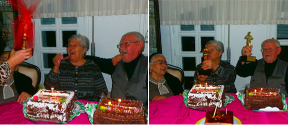 Bütün sıkıntılarına/yorgunluklarına/hastalıklarına rağmen… Hayata hep bir çocuk gibi şaşarak/sevinçle bakabilen, ağlamak kadar ağız dolusu kahkahalar da atabilen, gönülleri biz gençlerden de genç iki yaşlının, o gece çocuk kahkahalarıyla, mutluluk gözyaşlarıyla pastalarının mumunu söndürüşünü izledik.