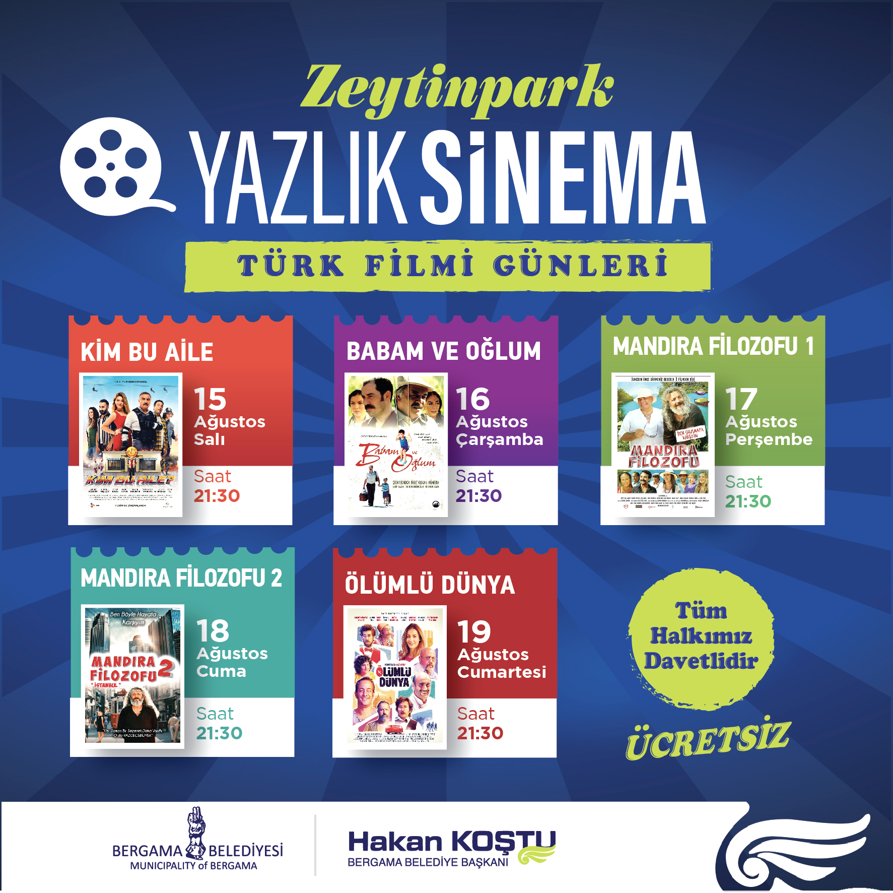 Eski zamanların en sevilen etkinliklerinden biri olan açık hava sinemalarını hatırlatmak, yaz akşamlarının serinliğinde keyifle film izlemek için düzenlenen etkinlik 5 gece boyunca sürecek. 'Türk Filmi Günleri' konseptinde düzenlenecek film geceleri saat 21.30'da ücretsiz biçimde halkla buluşacak.