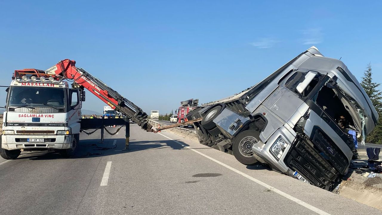 Kaza, dün saat 07.00 sıralarında Afyonkarahisar-Ankara kara yolunda meydana geldi. M.D. (36) yönetimindeki 03 AHM 745 plakalı beyaz eşya taşıyan TIR, sürücüsünün hakimiyetini kaybetmesiyle Ümraniye köyü yakınlarında refüje devrildi. Sürüklenen TIR'ın sürücüsü M.D. ile beraberindeki A.Ç. (39) yaralandı. Çevredekilerin durumu 112 Acil Çağrı Merkezi'ne bildirmesi üzerine kaza yerine sağlık, jandarma, itfaiye ve AFAD ekipleri sevk edildi. AFAD ekipleri TIR'da sıkışanları kurtararak sağlık ekiplerine teslim etti. İlk müdahalesi olay yerinde yapılan yaralılar Emirdağ Devlet Hastanesi'ne götürüldü. Tedaviye alınan yaralılardan A.Ç., durumunun ağır olduğu bildirildi. (DHA)