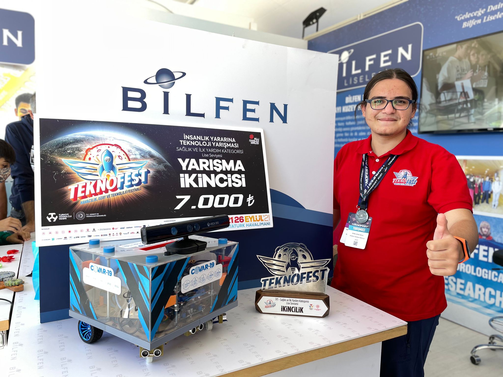 Ön değerlendirme ile kabul edilen 195 proje arasından 53 proje arasına girerek TEKNOFEST kapsamında düzenlenen 'İnsanlık Yararına Teknoloji' yarışmasına katılmaya hak kazanan Bilfen Liseleri öğrencisi Aksel Deniz Akgül, tasarladığı 'COVAR-19' isimli robotuyla ikincilik ödülüne layık görüldü.