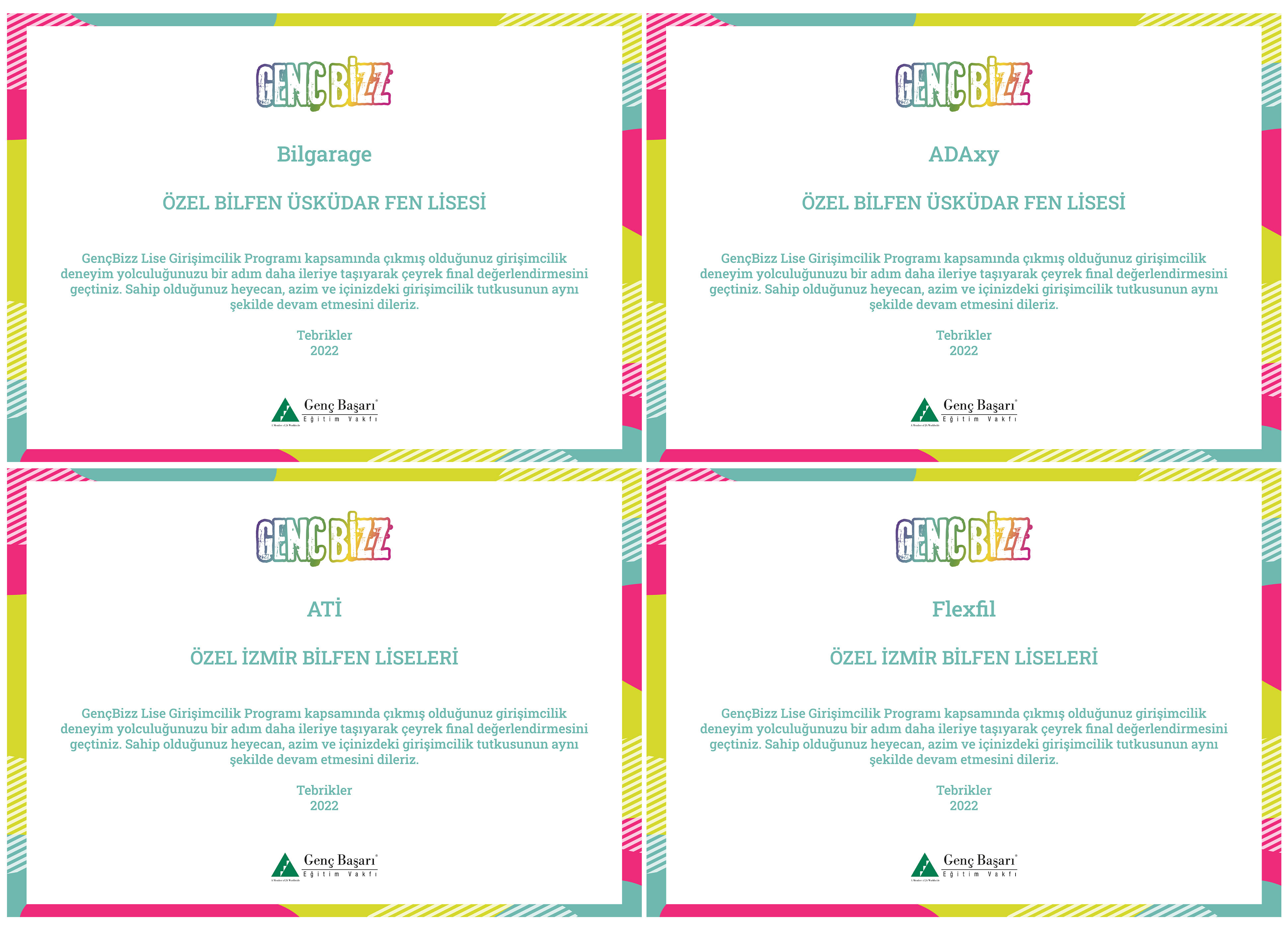 Özel İzmir Bilfen Lisesi bu yıl dördüncü kez 'GençBizz' lise girişimcilik programına katıldı. Bilfen Anadolu ve Fen lisesi 9.ve 10. Sınıf öğrencileri Mert KAYALAR, Elif YAVAŞ, M. Mert KAĞITÇIOĞLU, Ceren BERK, Ege OCAKÇI, Yavuz AYAN, Emirhan Efe YILDIRIM, Zeynep Duru ASLAN, Adnan Can KILIÇOĞLU, Sena SAĞLAM'ın kurduğu şirket ATİ VE FLEXFİL önceki yıllarda olduğu gibi bu yıl da yine iddialı çevreci projelere imza atarak jürilerden destek aldılar. Gençler, Türkiye genelinde çok sayıda okuldan çok sayıda şirketin katıldığı yarışmada yarı finalist oldu.