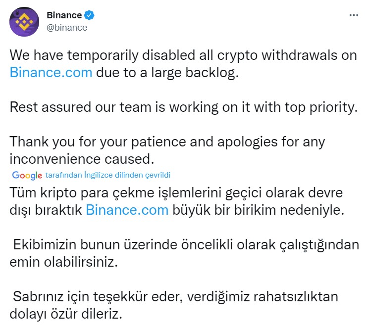 Binance, sosyal medya hesabından yaptığı açıklamada 'Büyük bir birikme nedeniyle tüm kripto para çekme işlemlerini geçici olarak devre dışı bıraktık. Ekibimiz bunun üzerinde öncelikli olarak çalışıyor' ifadelerinde bulundu.