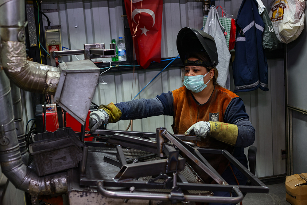 'Kaynak yapmayı burada öğrendim, ilk geldiğimde kadın sayısı azdı gün geçtikçe sayımız arttı. Ustalaştım artık, yeni gelen birçok kadın arkadaşıma öğrettim. Bence ellerimiz kaynağa daha yatkın, daha kolay ellerimizi kıvırıp çevirebiliyoruz. Önce zorluk çekiyoruz ama alışıyoruz. Daha güzel desen çıkardığımız için, kaynak da bir el işi olduğu için burada kadın tercih edilmeye başlandı.' (AA)