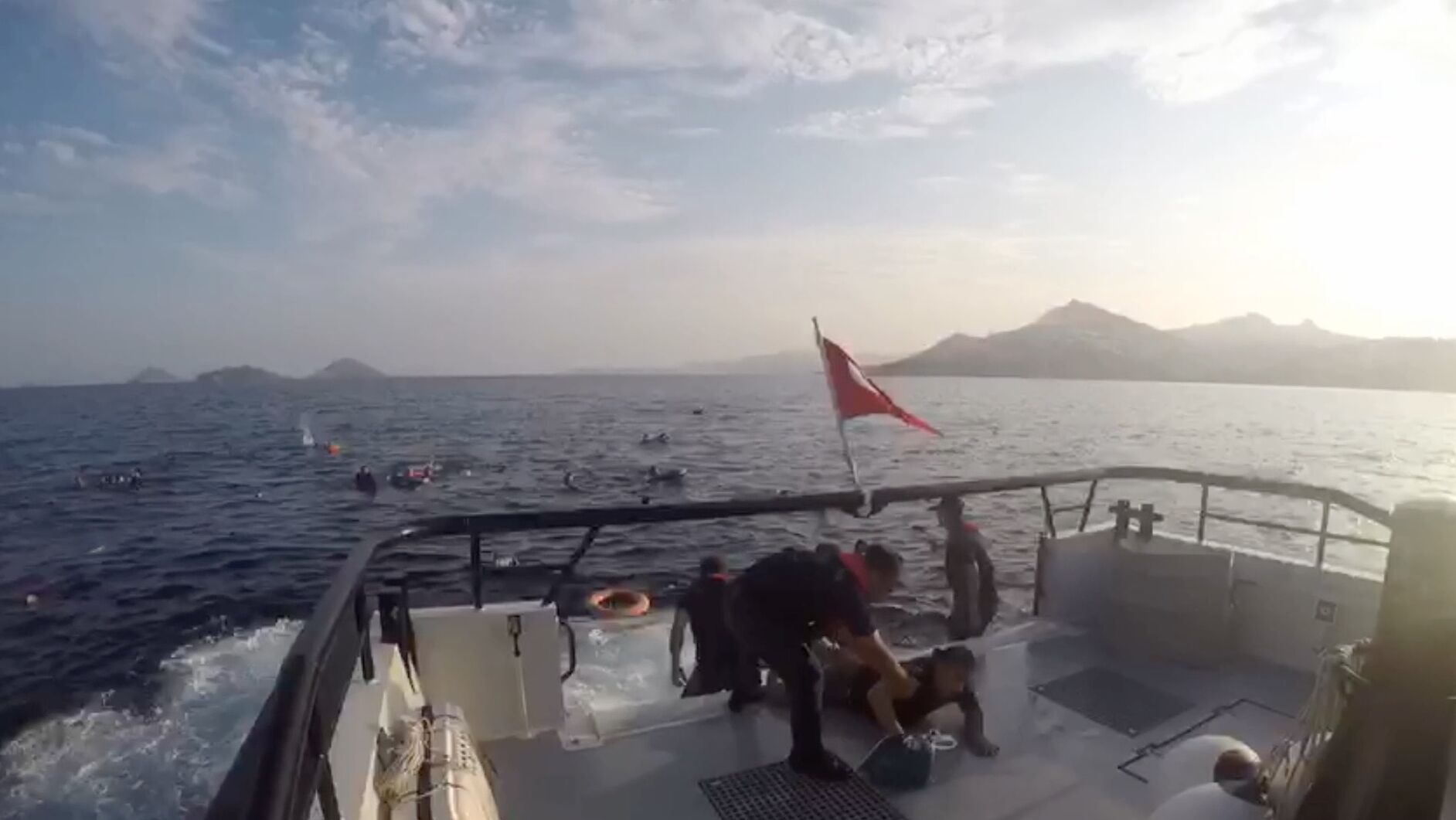 Göçmenlerin yaklaşık 40 kişi olduklarını söyledikleri 34 metre derinlikte bulunan teknedeki kayıp kişi veya kişileri arama kurtarma çalışmaları devam ediyor.