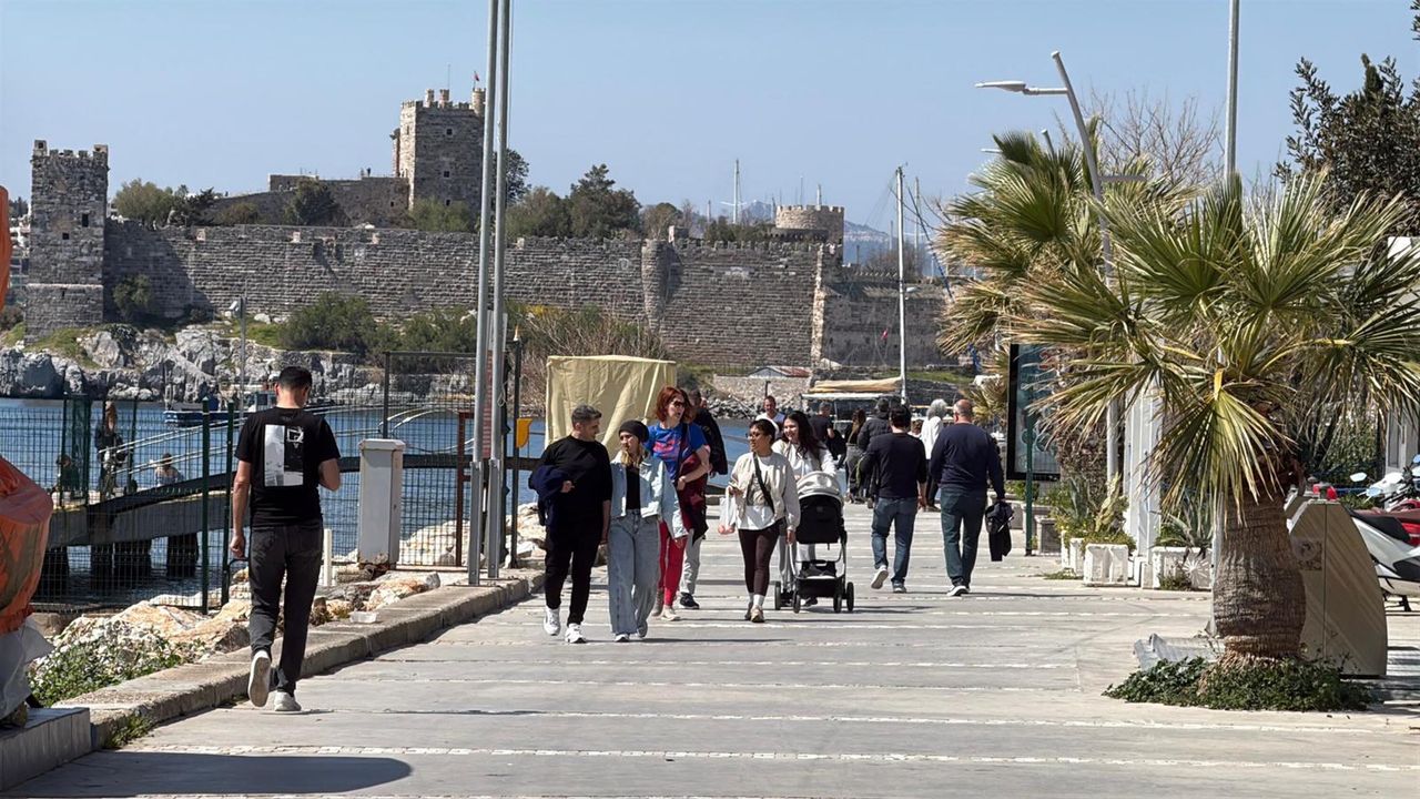 Ramazan Bayramı tatilinin son gününde, önemli turizm merkezlerinden Bodrum'da güneşli ve sıcak hava etkisini gösterdi. Hava sıcaklığının 20, deniz suyu sıcaklığının ise 17,7 derece ölçüldüğü ilçede tatilciler, sabahın erken saatlerinden itibaren sahillere yöneldi. Özellikle Gümbet ve Kumbahçe plajlarına gelen tatilciler mart ayı sonu olmasına rağmen denize girerek keyifli vakit geçirdi. Bazı turistler ise kumsalda güneşlenmeyi ve kitap okumayı tercih etti. Kent merkezi ve yarımadanın tarihi noktalarında da yoğunluk gözlenirken, yerli ve yabancı turistler yürüyüş yaparak güneşli havanın keyfini çıkardı. (DHA)