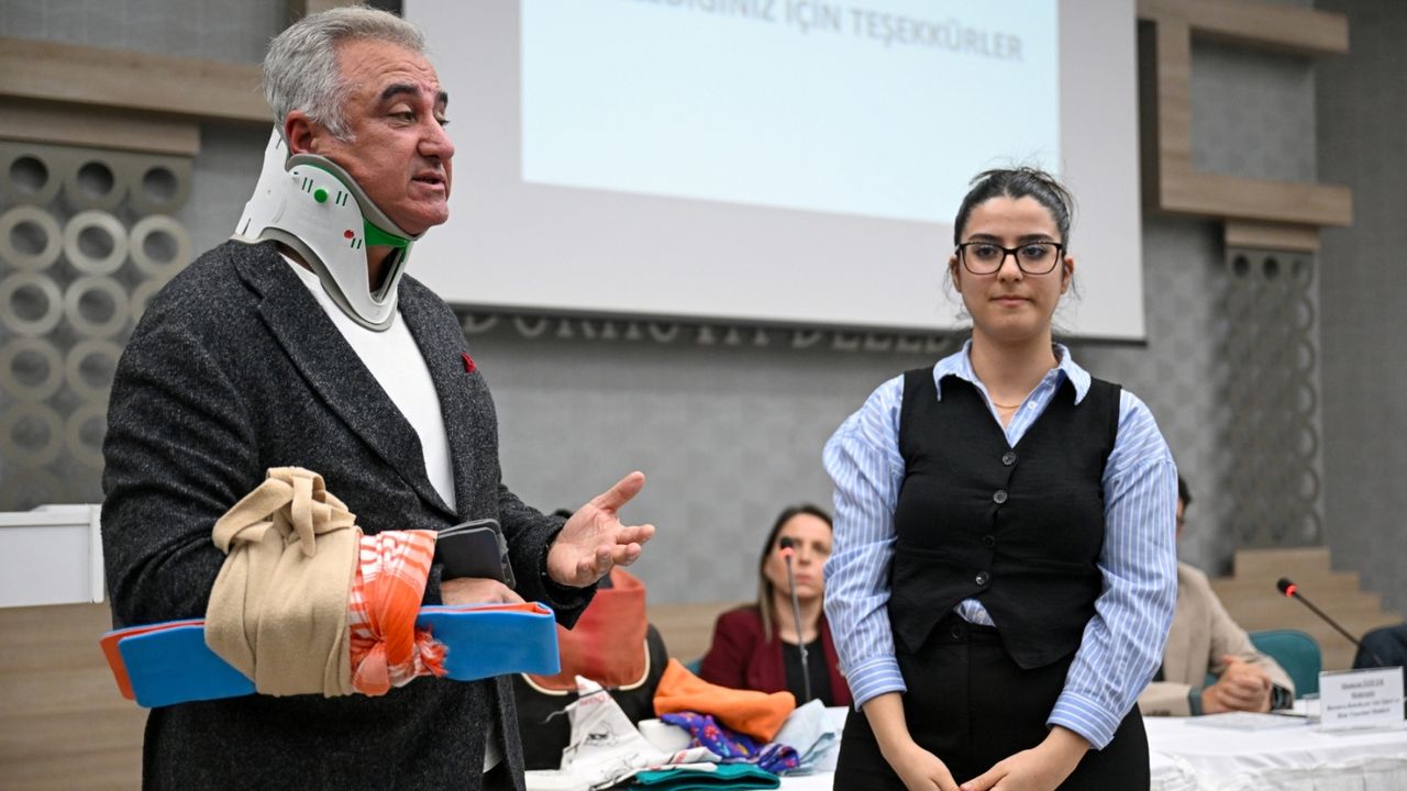 Sunumunda deprem çantasının önemini vurgulayan Rodoplu, kırık, çıkık ve kanamalarda yapılması gerekenleri uygulamalı olarak göstererek,“Deprem çantasında özellikle kanamayı durdurmaya yönelik malzemeler mutlaka bulunmalı.” ifadelerini kullandı.