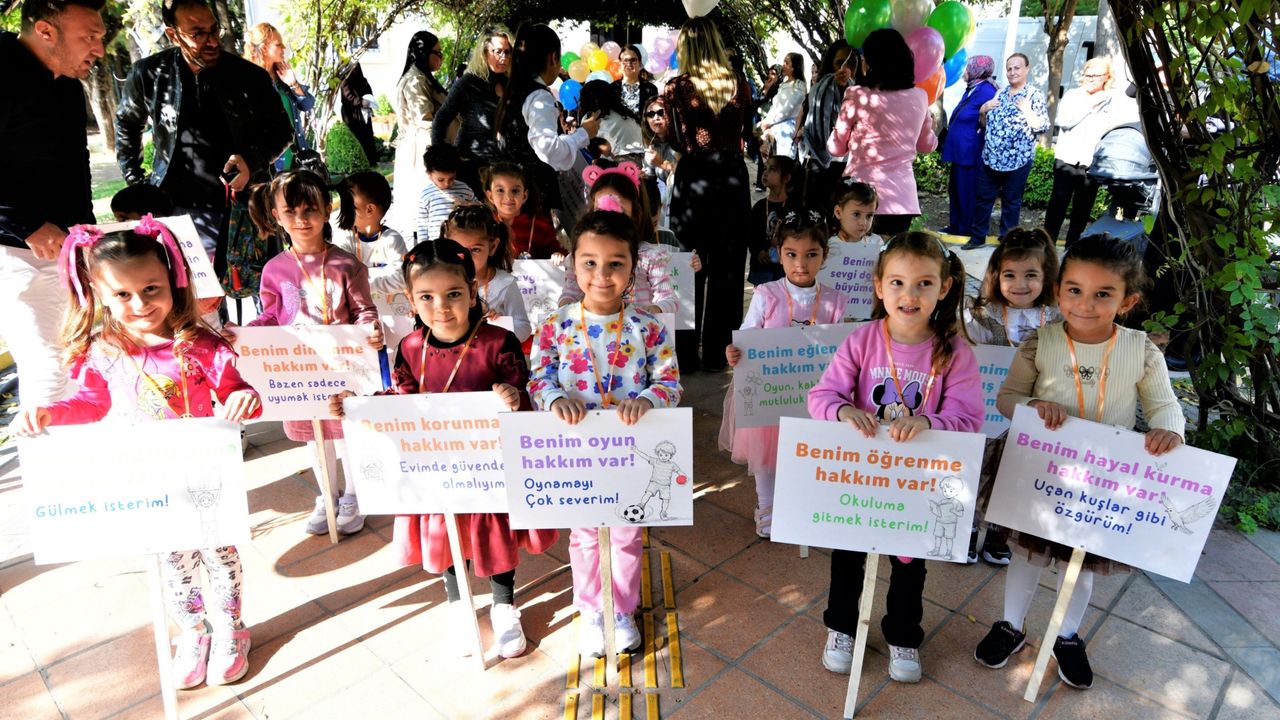 Bornova Belediyesi Ana Hizmet Binası önünde bir araya gelen çocuklar, ellerinde çocuk haklarını anlatan renkli pankartlarla Büyükpark içindeki Uğur Mumcu Kültür ve Sanat Merkezi’ne yürüdü. Burada ilk olarak 10 yaşındaki 4. sınıf öğrencisi Aşk Nefes Koca, Dünya Çocuk Hakları Günü’ne özel olarak hazırlanan manifestoyu okudu.