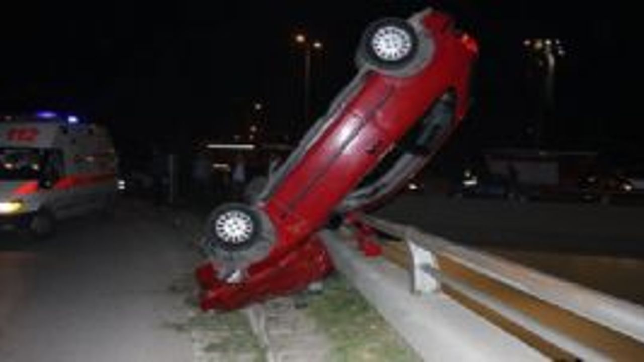 Çarpmanın etkisiyle ön kısmından dikilen otomobil, korkuluklara yaslandı.